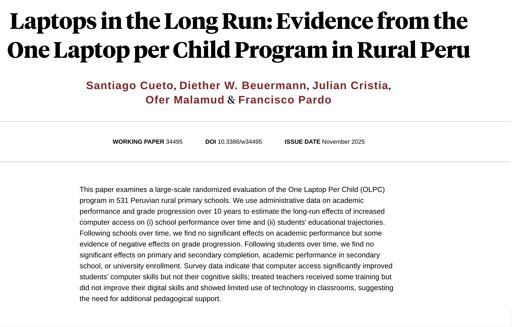 The post title is hugely overstating the study: one country’s laptop-oriented program didn’t help academic performance for first adopters.